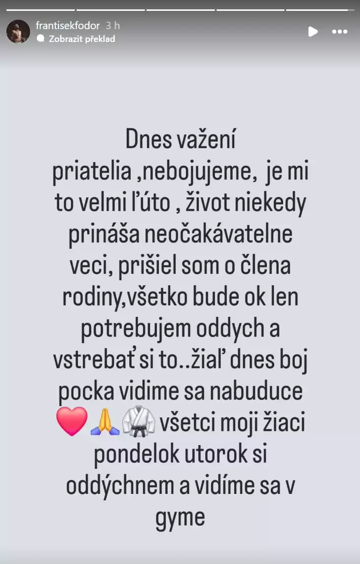 "Dnes vážení priatelia, nebojujeme, je mi to velmi lúto, život niekedy prináša neočekavatelne veci, prišel som o člena rodiny, všetko bude ok len potrebujeme oddych a vstrebať si to. Žial dnes boj počká, vidíme sa nabuduce. Všetci moji žiaci pondělok-úterok si oddýchnem a vidíme sa v gyme," napsal Fero Fodor v příběhu na Instagramu.