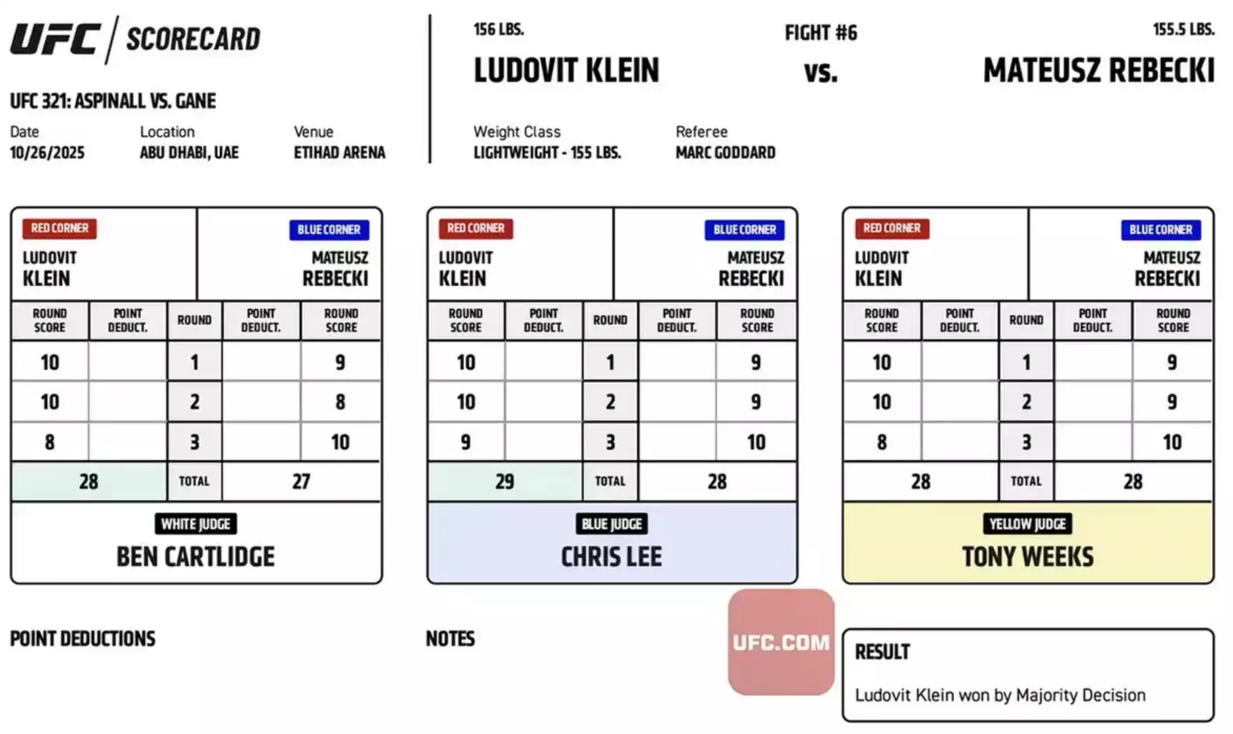 Lajoš Klein ukázal velké srdce a třetí kolo přežil, ale nechybělo málo a ze souboje mohla být většinová remíza (majority draw). Naštěstí rozhodčí Ben Cartlidge nešetřil s hodnocením 10:8, protože druhé kolo tímto způsobem získal Klein (ostatní dva rozhodčí udělili 10:9) a třetí naopak Rebecki. Jak vypadal kompletní bodový lístek?