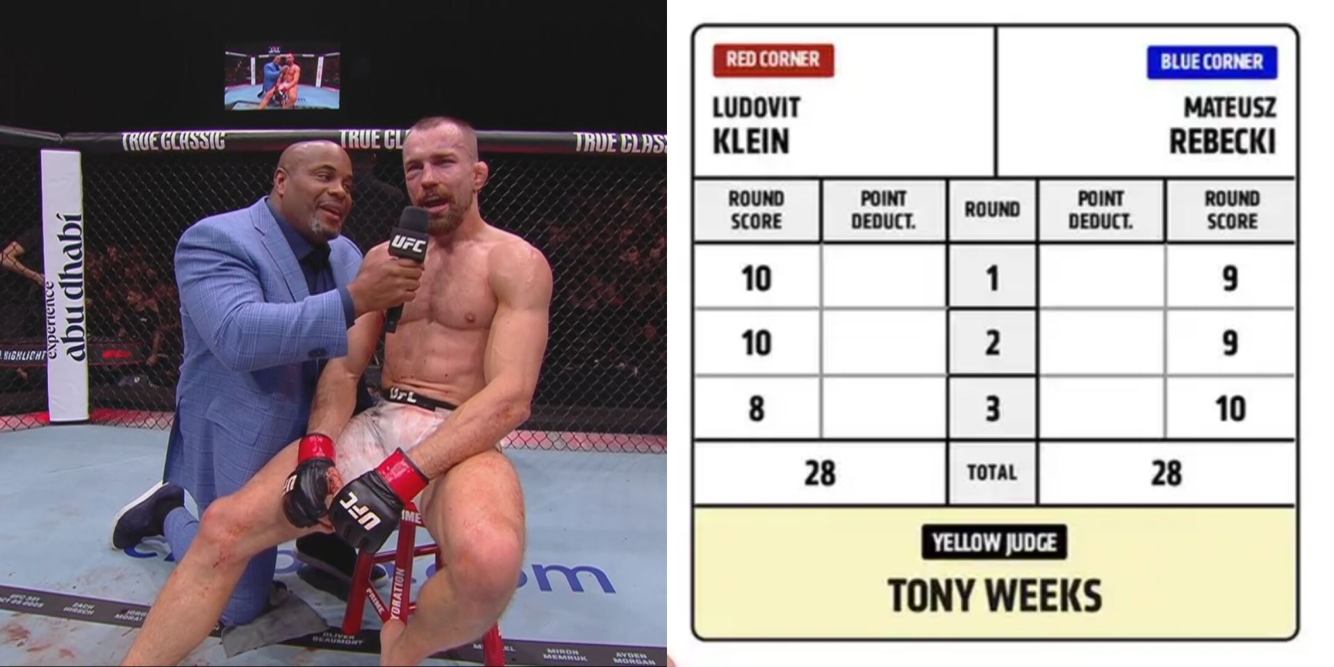 Lajoš Klein ukázal velké srdce a třetí kolo přežil, ale nechybělo málo a ze souboje mohla být většinová remíza (majority draw). Naštěstí rozhodčí Ben Cartlidge nešetřil s hodnocením 10:8, protože druhé kolo tímto způsobem získal Klein (ostatní dva rozhodčí udělili 10:9) a třetí naopak Rebecki. Jak vypadal kompletní bodový lístek?