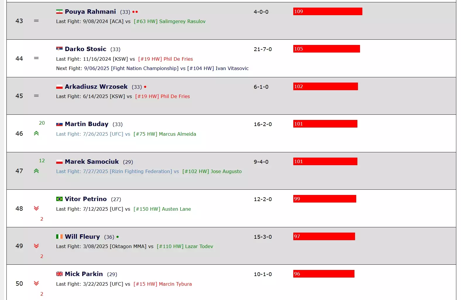Slovenský bojovník Martin Buday se nyní v UFC pyšní bilancí 7-1, což je mimochodem historicky nejlepší bilance československého zápasníka v UFC. Po posledním vítězství nad Marcusem Buchechou se Buday výrazně posunul ve světovém žebříčku Fight Matrix.