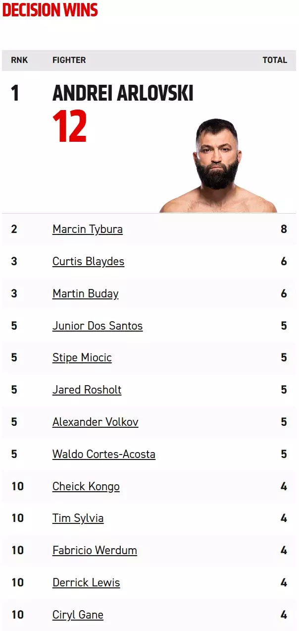 Martin Buday zaznamel své šesté vítězství na body v UFC, což ho aktuálně řadí na třetí místo v počtu bodových vítězství v těžké váze. O třetí místo se dělí s Curtisem Blaydsem, na druhém místě se nachází Marcin Tybura s osmi vítězstvími na body a na prvním místě je bývalý šampion těžké váhy Andrei Arlovski, který jich má na svém kontě 12.