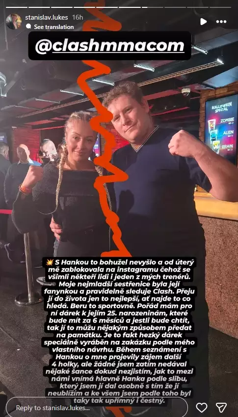 "S Hankou to bohužel nevyšlo a od úterý mě zablokovala na Instagramu, čehož si všimli někteří lidé i jeden z mých trenérů. Moje nejmladší sestřenice byla její fanynkou a pravidelně sleduje Clash. Přeju jí do života jen to nejlepší, ať najde to, co hledá. Beru to sportovně. Pořád mám pro ni dárek k jejím 25. narozeninám, které má za 6 měsíců, a jestli bude chtít, tak jí to můžu nějakým způsobem předat i zpětně na památku. Je to fakt hezký dárek, speciálně vyráběný na zakázku podle mého vlastního návrhu.