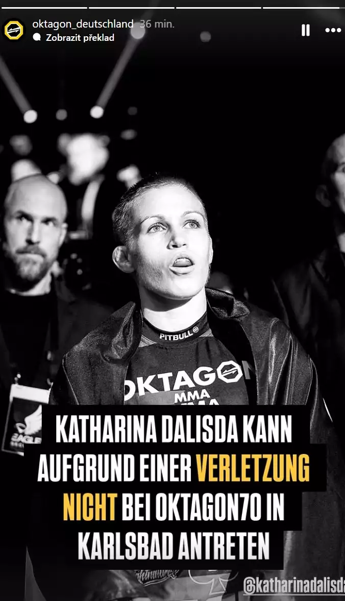"Katharina Dalisda nemůže kvůli zranění startovat na turnaji OKTAGON 70 v Karlových Varech," informovala organizace OKTAGON na svých sociálních sítích. Dalisda se na turnaji OKTAGAON 70 měla střetnout s Elin Öberg.
