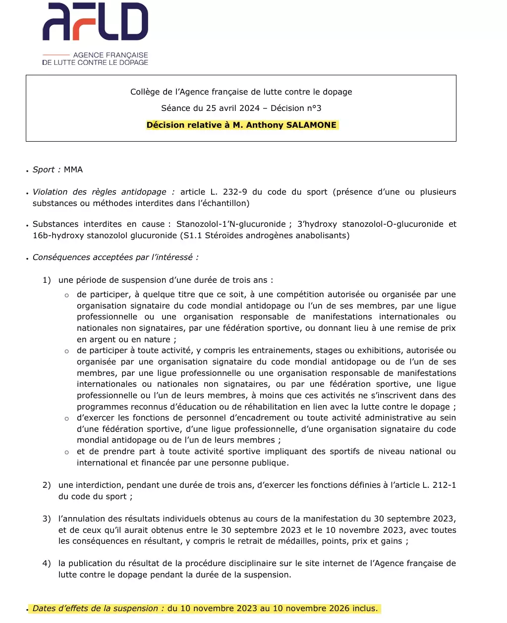 V případě Anthonyho Salamona jde o: Porušení antidopingových pravidel: článek L. 232-9 francouzského sportovního zákoníku (přítomnost jednoho nebo více pozitivních dopingových testů). Zakázané látky: stanozolol-1'N-glukuronid; 3'hydroxy stanozolol-O-glukuronid a 16b-hydroxy stanozolol-glukuronid (S1.1 Anabolické androgenní steroidy). Zákaz činnosti od 10. listopadu 2023 do 10. listopadu 2026.