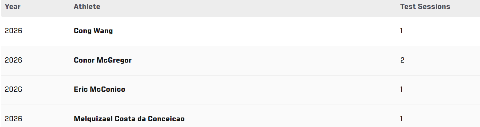 Podle aktuálních informací má bývalý šampion Conor McGregor tento rok za sebou již dva antidopingové testy. Častější výskyt antidopingových testů u konkrétního bojovníka většinou signalizuje, že se aktivně nachází v testovacím programu UFC a počítá s návratem/zápasem. Po dvou testech má v UFC aktuálně pouze osm zápasníků.