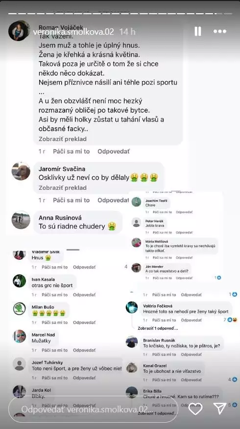 "Video na Facebooku, pamätám si ten moment. Vidím veľké čísla, som po výhre, šťastná, hrdá na seba, že som prvýkrát spravila váhu 57 kg. Otvorím komentáre, lebo ich bolo naozaj veľa. Moje naivné ja čakalo samé krásne odkazy, gratulácie… No namiesto toho som sa dočkala nenávisti. Vtedy ma to veľmi ranilo. Teraz, s odstupom času, ma to posilnilo. Ale aj tak si myslím, že by sme nemali byť ticho. Prečo ľuďom na sociálnych sieťach dovolíme, aby sa takto ku mne, alebo komukoľvek inému, správali? Nemali by za svoje správanie niesť zodpovednosť? Ani jeden komentár nebol od mladého človeka. Všetko to boli rodičia, prarodičia, babky, dedkovia. Keby som videla, že moja babka niekoho uráža na internete, hanbila by som sa a okamžite jej vysvetlila, ako sa má správať. Prečo sa ľudia nezamyslia, že by mali byť dobrým vzorom pre svoje deti a vnúčatá? Neviete, že keď sa takto správate, deti to budú brať ako normu a budú sa správať rovnako, vonku, v škole?" rozpovídala se Smolková.