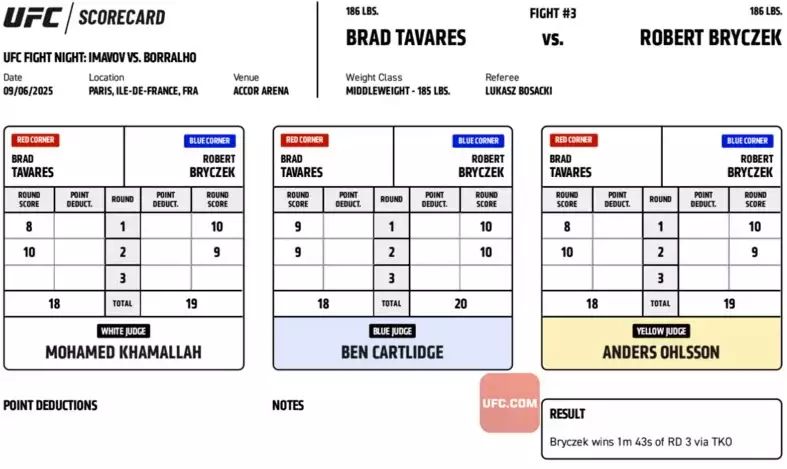 Ve druhém kole však viditelně zpomalil a byl to Tavares, kdo zvítězil u dvou rozhodčích - tentokrát v poměru 10:9, ale jeden viděl kolo pro Poláka 10:9. Bryczek ve třetím kole "šlápnul na plyn" a dokázal Tavarese ukončit (video níže).