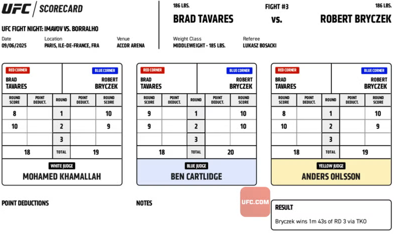 Ve druhém kole však viditelně zpomalil a byl to Tavares, kdo zvítězil u dvou rozhodčích - tentokrát v poměru 10:9, ale jeden viděl kolo pro Poláka 10:9. Bryczek ve třetím kole "šlápnul na plyn" a dokázal Tavarese ukončit (video níže).