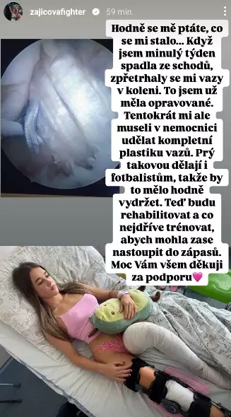 "Nic jsem teď nedávala na IG, ale bylo to tím, že jsem byla strašně smutná ze všeho. Nerada ruším zápasy, ale v tomhle stavu se opravdu nedalo nastoupit. Musela jsem na operaci. Chtěla jsem se ozvat před, ale sotva jsem přišla a už mě brali na sál. Nic jsem nestihla. Operace tvrala strašně dlouho. Byla jsem tam asi přes 2 hodiny. Prý to dopadlo skvěle, tak doufám, že ano.